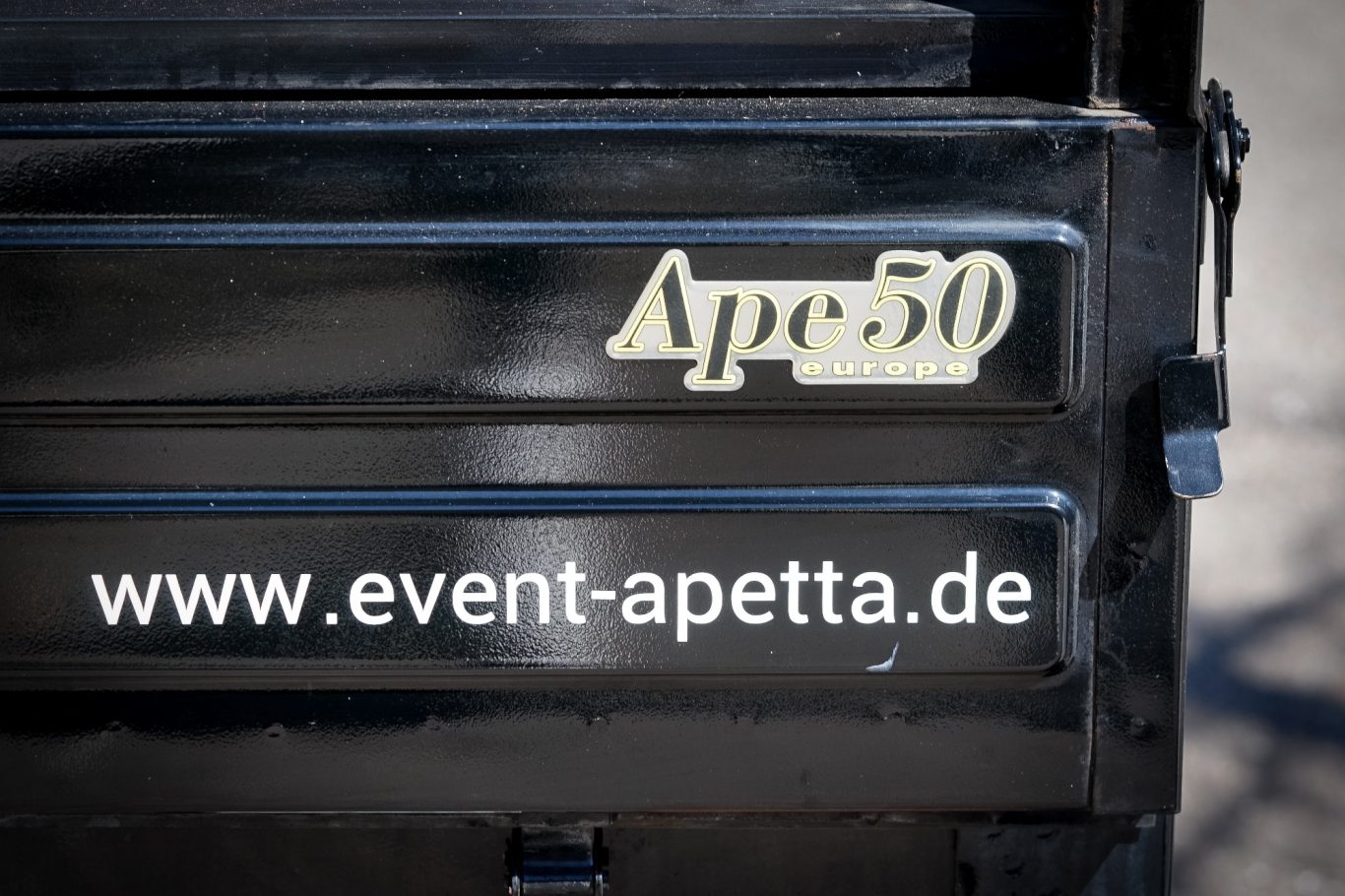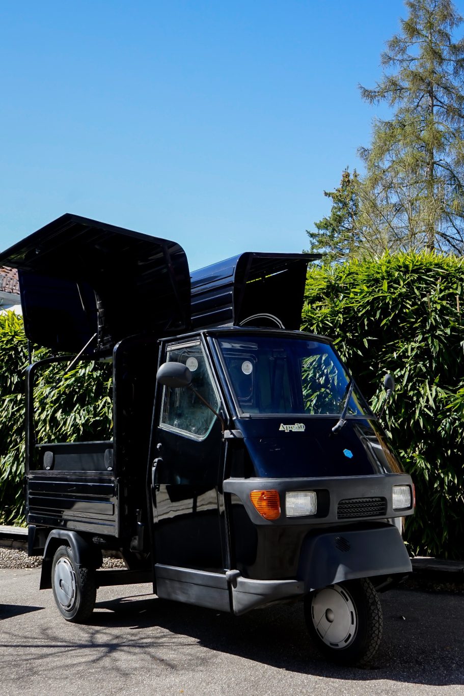 Unsere kleine schwarze Ape 50 ist nicht nur ein Fahrzeug. Sie ist ein echter Hingucker und zieht alle Blicke auf sich!